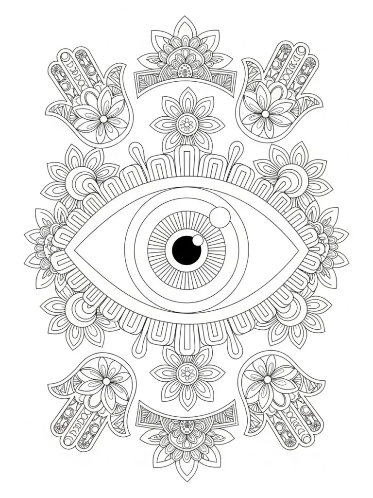 This coloring page showcases a bold evil eye at the center, surrounded by layers of floral patterns and delicate hamsa hands placed in perfect symmetry. The design blends smooth curved lines with fine decorative details, creating a rich layout that feels protective and graceful at the same time. Flowers bloom outward around the eye, while the hamsa motifs add meaning and balance without overpowering the main focal point. The line work is clean and consistent, with enough detail to feel intricate but still open enough to color comfortably.