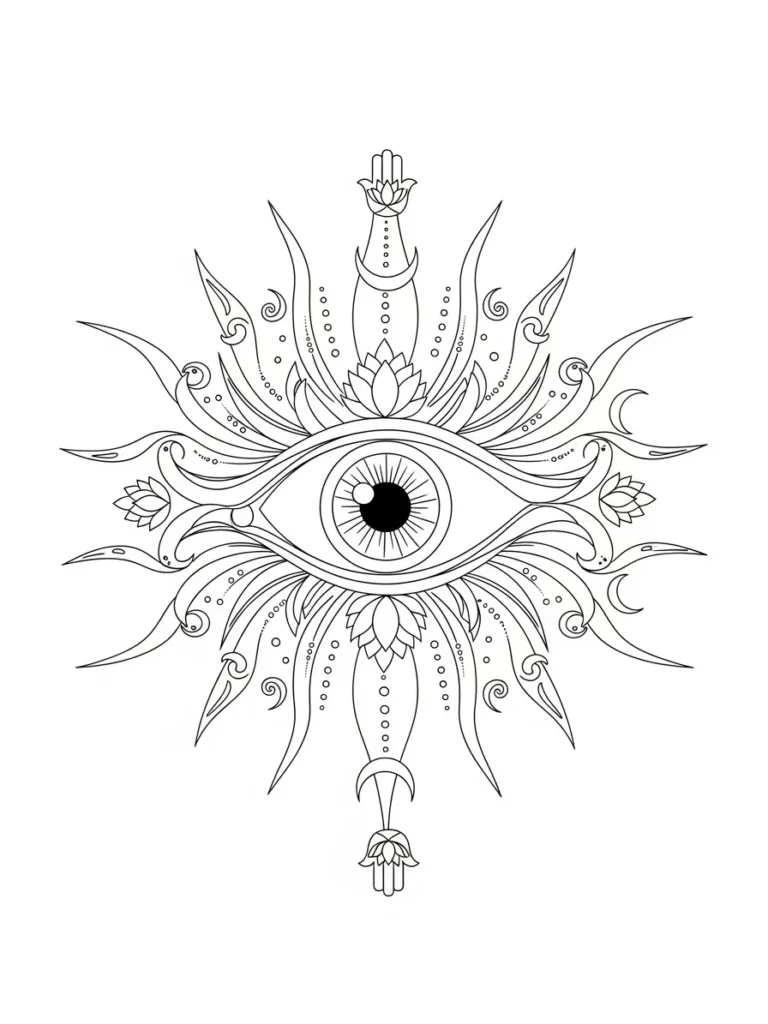 This coloring page features a dramatic evil eye at the center, surrounded by flowing ornamental shapes that feel both mystical and elegant. Curved crescent forms, lotus inspired petals, and dotted accents extend outward in a symmetrical layout that feels airy and expressive. The line work is smooth and slightly varied, giving the design movement without making it messy. The open background keeps the focus on the eye and its decorative elements, making the whole page feel light, balanced, and visually striking.