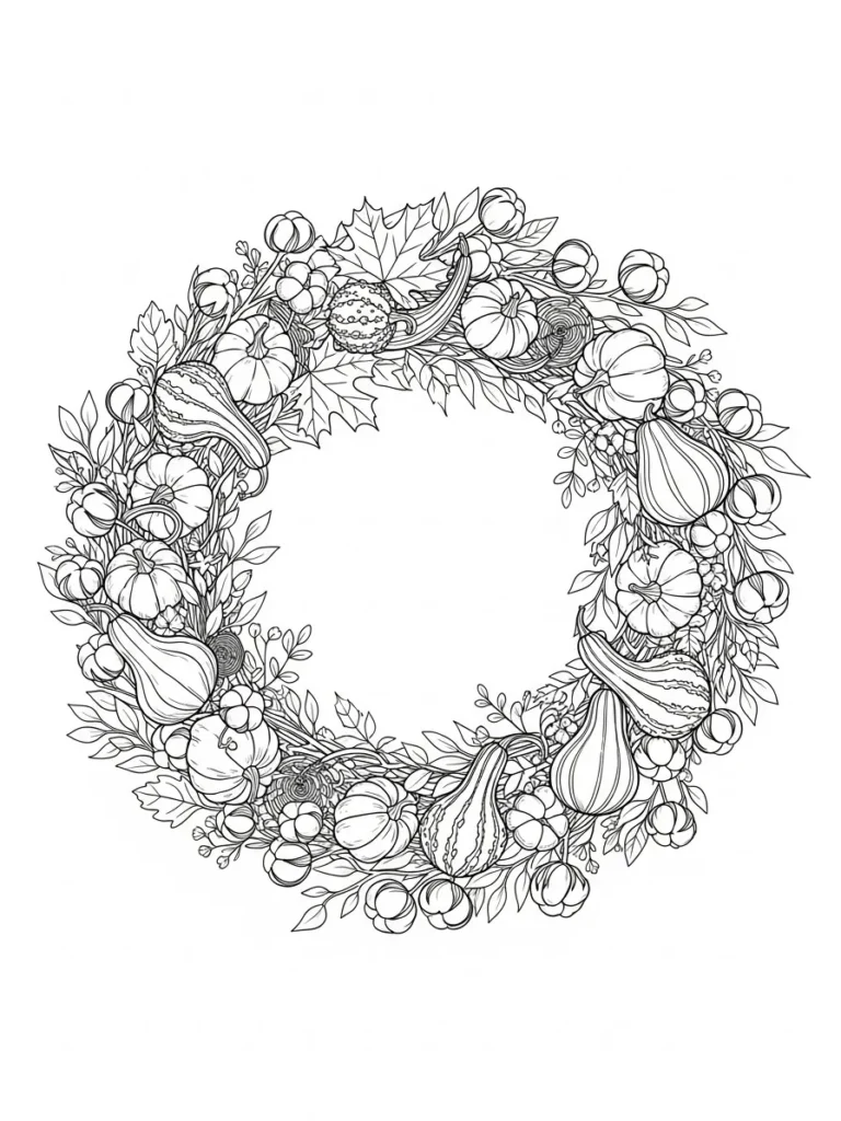 This coloring page features a beautifully detailed fall wreath made up of pumpkins, gourds, berries, leaves, and curling vines arranged in a full circular design. The line work is clean and refined with a mix of medium and fine lines that give each element its own texture and personality. Pumpkins and squash overlap with leafy branches and small berry clusters, creating a lush harvest look that feels balanced but still wonderfully full. The open center keeps the design airy while the outer ring stays rich with cozy autumn detail.