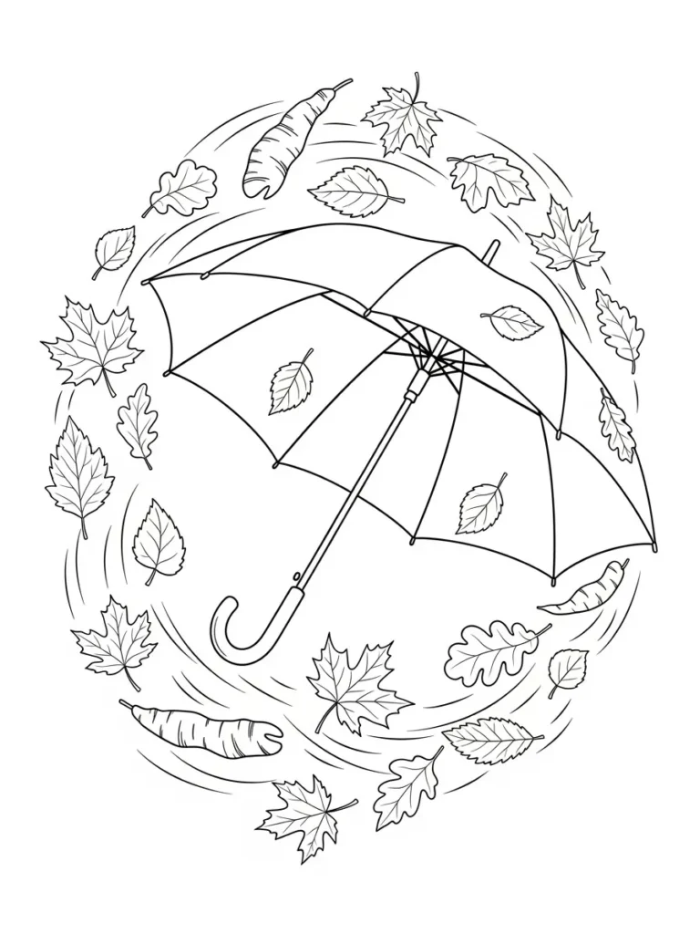 This coloring page features a graceful umbrella caught in a swirl of falling autumn leaves, all arranged in a soft circular motion around the center. The umbrella sits at an angle that adds movement, while the leaves vary in shape and size to keep the design feeling light and airy. Clean smooth lines define each leaf and curve of the umbrella, with gentle motion lines suggesting a breezy fall day. The open space around the design keeps it uncluttered and calm while still feeling playful and seasonal.