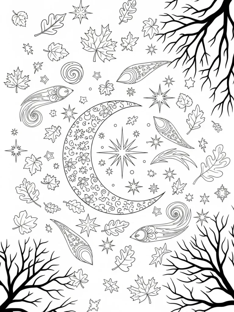 This coloring page features a dreamy fall night scene with a large crescent moon at the center surrounded by swirling stars, drifting leaves, and whimsical wind shapes. Bare tree branches frame the corners, adding a slightly magical forest feel without making the page feel heavy. The moon is filled with delicate patterns and florals, while the surrounding elements vary in size and shape to create gentle movement across the page. The line work is clean and playful with a mix of bold outlines and finer details that make the whole design feel airy and imaginative.