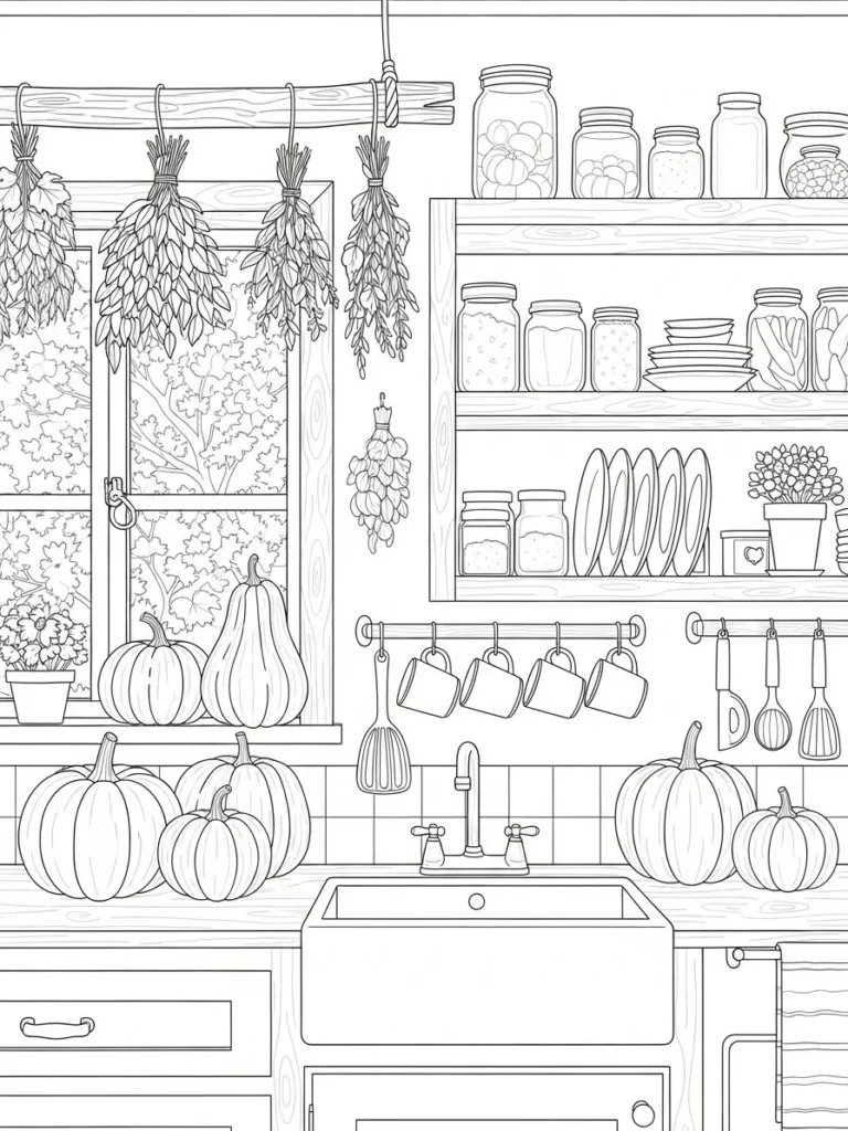 This coloring page shows a warm and welcoming fall kitchen filled with pumpkins, hanging herbs, open shelves, and charming everyday details. Pumpkins sit along the countertop and windowsill while dried herbs hang above the sink, adding a rustic seasonal touch. Shelves are lined with jars, dishes, and mugs, creating a cozy lived in feel without looking cluttered. The line work is clean and detailed with fine textures in the wood grain, glass jars, and leafy herbs, balanced by clear outlines that make the scene easy and enjoyable to color.