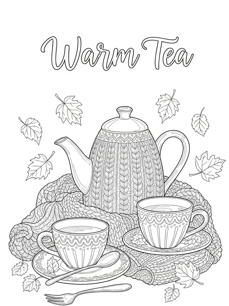This coloring page features a comforting fall tea setup with a patterned teapot, two teacups on saucers, and a chunky knitted blanket beneath them. Delicate leaf details decorate the teapot and cups, while loose autumn leaves float gently around the scene. The hand drawn lettering at the top adds a playful touch without overpowering the design. Line work is clean and detailed, especially in the knit textures and teacup patterns, while the overall layout feels balanced and cozy.