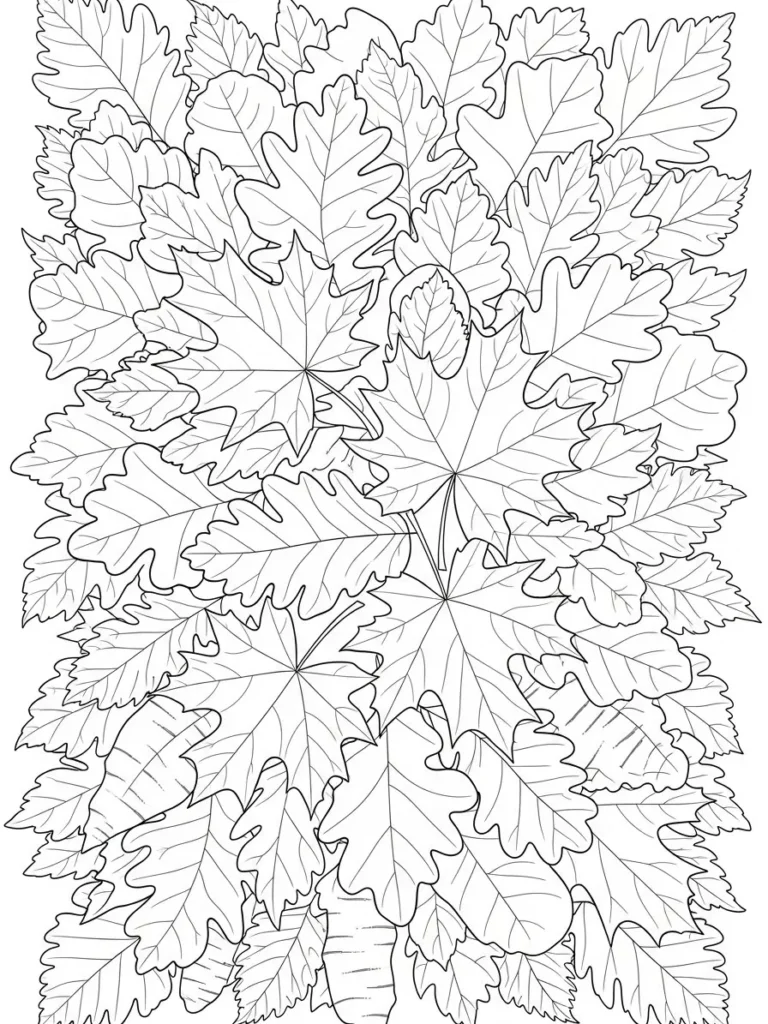 This coloring page is filled edge to edge with overlapping fall leaves in a variety of classic shapes and sizes. Maple and oak style leaves layer over one another to create a rich all over pattern that feels full without being too busy. The outlines are clean and slightly varied in thickness, giving each leaf its own space while still blending beautifully into the overall design. Vein details add gentle texture and make the page feel detailed and satisfying for adult coloring.