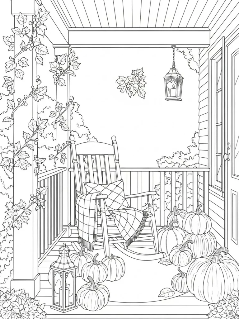 This coloring page shows a charming fall front porch scene with a rocking chair dressed in a soft blanket and pillow, surrounded by pumpkins of all sizes. A lantern rests on the floor while climbing vines and leafy details frame the porch columns and railing. The layout feels open and inviting, with clean lines defining the porch structure and finer details adding texture to the fabrics, wood panels, and pumpkins. Everything is balanced so the scene feels cozy without being overwhelming to color.