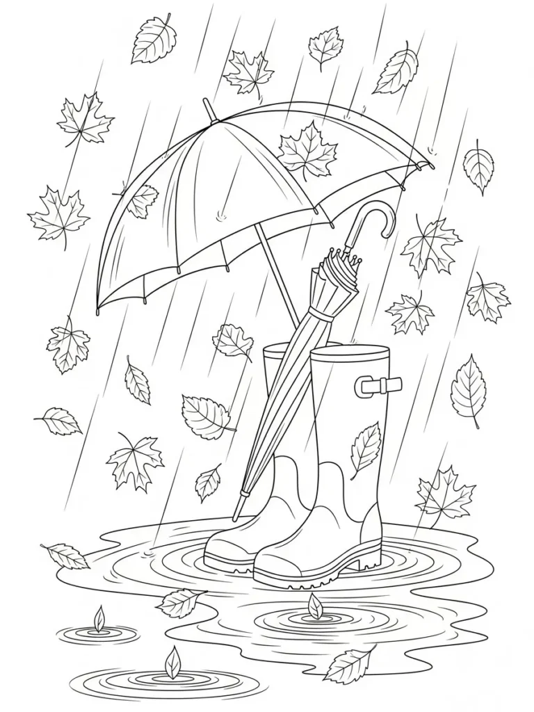 I find this page so relaxing because it instantly reminds me of quiet rainy afternoons in fall. Coloring the boots and leaves feels calming and familiar in the best way. I like choosing warm earthy tones for the leaves and softer shades for the rain to set a cozy mood. This is the kind of page I enjoy when I want something peaceful that still feels playful and seasonal.