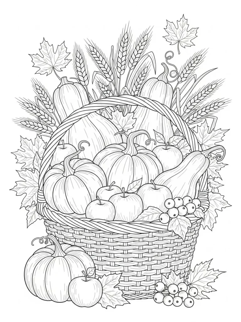 This coloring page showcases an overflowing wicker basket bursting with the bounty of the season. We see lovely, plump pumpkins and gourds mixed in with crisp apples and delicate clusters of berries. Towering behind the basket are tall stalks of wheat and scattered maple leaves which give the whole arrangement a wonderful height and texture. The linework is crisp and well-defined, especially notable in the detailed crosshatching pattern of the woven basket, offering a satisfying contrast to the smooth surfaces of the fruits and vegetables. The overall layout is dense and celebratory, perfectly capturing the spirit of a grand autumn harvest.