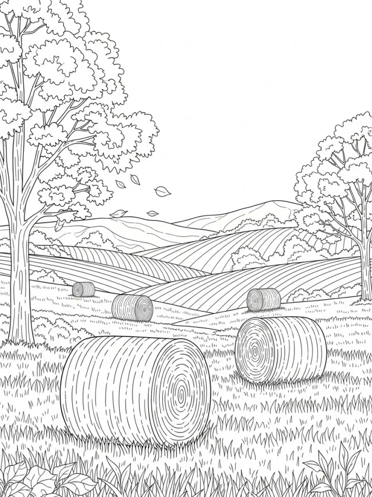 I just adore how relaxing this kind of scenery is to color, it’s the perfect page for an afternoon of quiet creativity. I’d definitely use all my favorite golden yellows and toasted browns for the hay bales to give them that sun-dried look. The rolling fields in the background offer a fantastic chance to practice gradients, moving from rich, freshly tilled earth tones to lighter taupes in the distance. The detail in the grass and the trees means I can spend ages mindfully coloring each little section, which is my favorite way to unwind and completely escape the everyday.