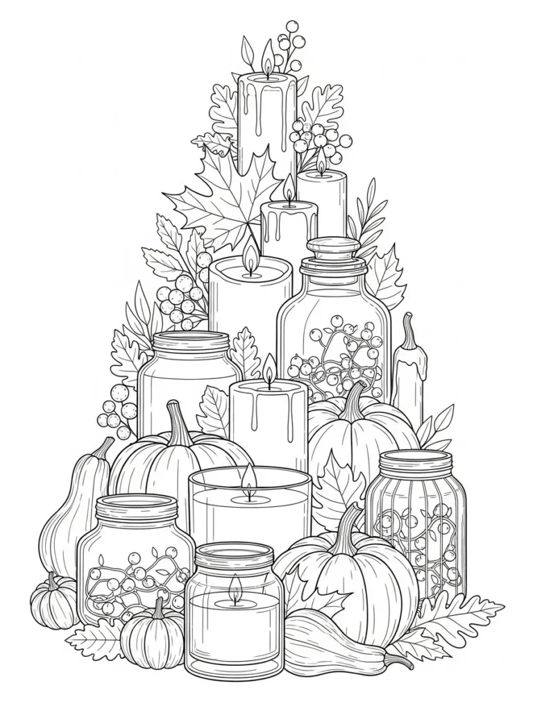 This coloring page features a cozy stacked arrangement of candles, pumpkins, glass jars, berries, and leafy branches all layered into a warm autumn still life. Tall pillar candles with gentle wax drips rise through the center while smaller jar candles and pumpkins fill out the base. The line work is clean and elegant with fine details in the leaves, berries, and glass textures, balanced by slightly thicker outlines that keep the design easy to follow. Everything feels full and inviting without being overwhelming, which makes the composition feel calm and intentional.