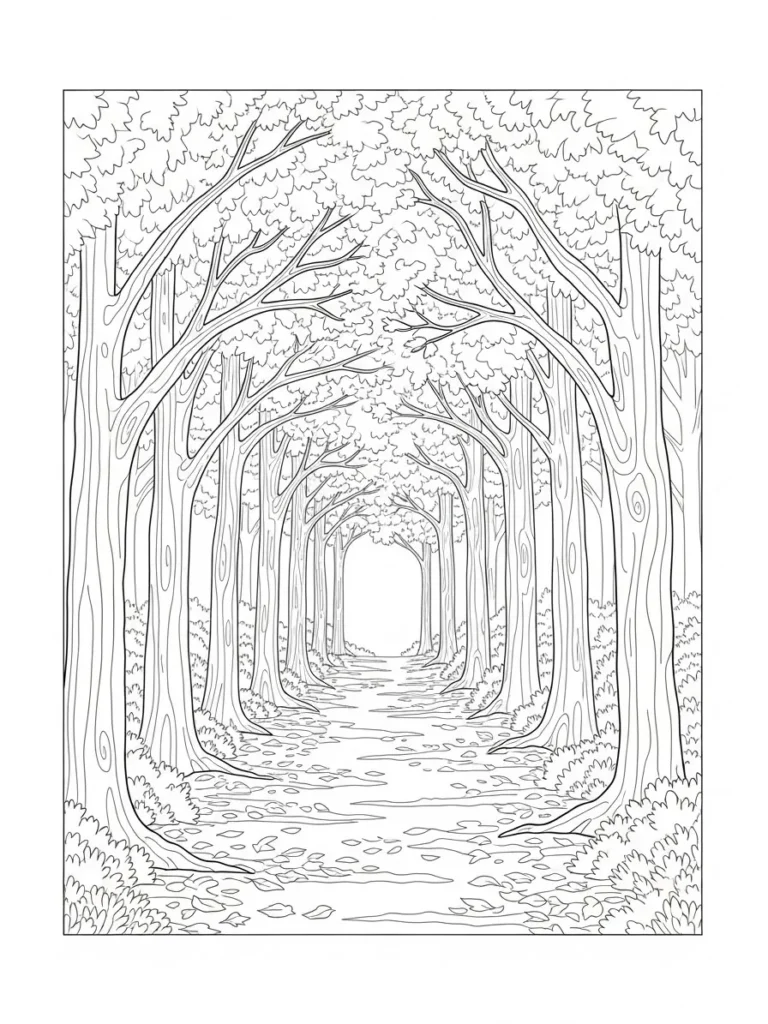 This coloring page shows a quiet forest path lined with tall trees that arch gently overhead to create a natural tunnel of leaves. The trunks are drawn with smooth flowing lines and subtle wood textures while the leafy canopy is filled with layered shapes that add depth without feeling too busy. Fallen leaves scatter along the path and bushes frame the sides, guiding the eye toward the open space in the distance. The line work stays clean and consistent with a mix of fine details and slightly thicker outlines that make the scene feel calm and inviting.