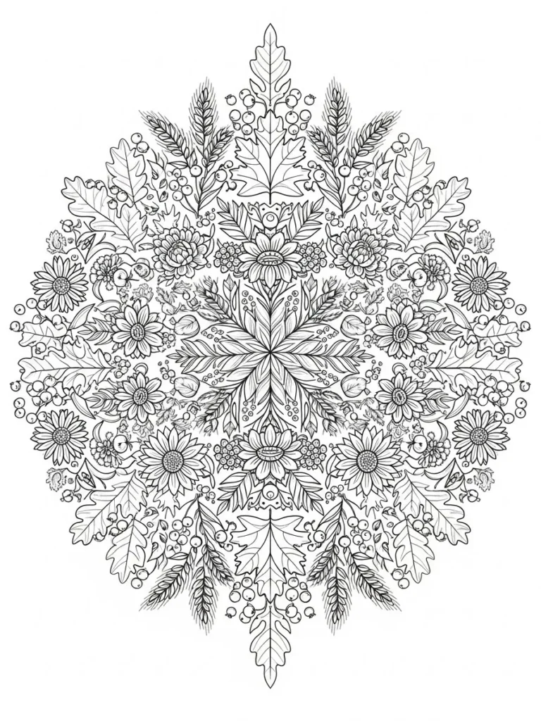 This coloring page features a beautifully symmetrical mandala made from fall inspired florals, leaves, berries, and wheat details. The design radiates outward from a detailed center flower, with repeating layers of petals, oak leaves, small blossoms, and textured foliage creating a balanced circular layout. Line work is fine and intricate, perfect for adult coloring, while the clean outlines keep each section clearly defined. The overall pattern feels rich and decorative without feeling cluttered, making it visually calming and satisfying to look at.