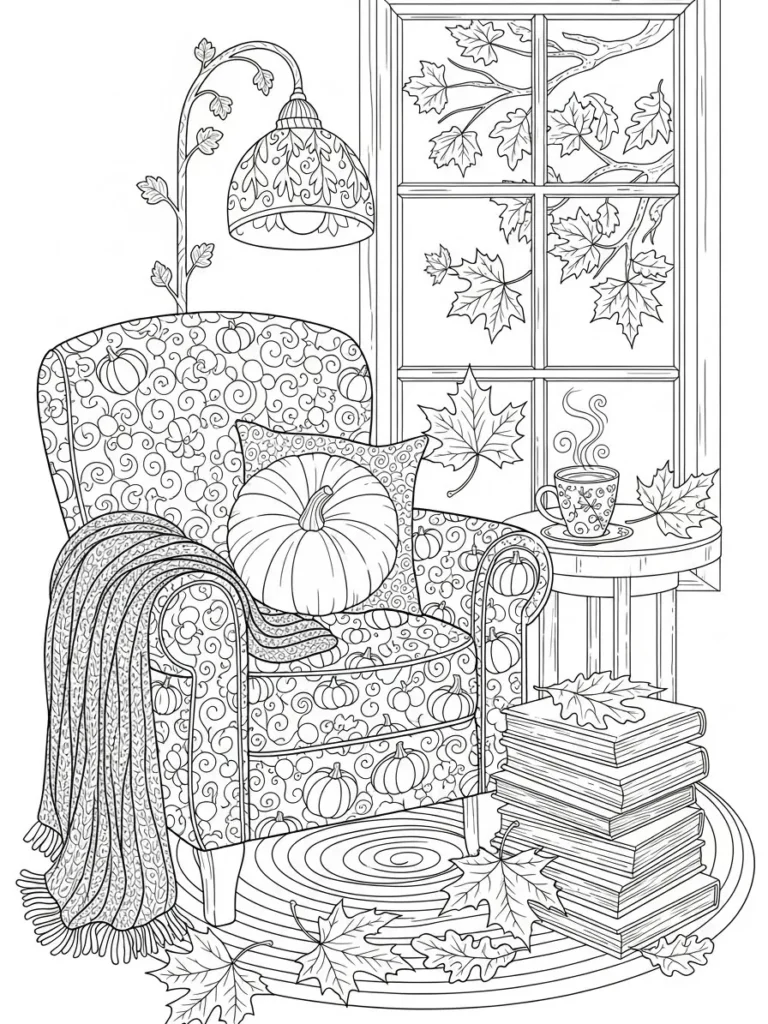 This coloring page shows an inviting fall reading corner with a plush armchair covered in pumpkin patterns, a soft throw blanket draped over the side, and a pumpkin pillow tucked right in the center. A small table holds a steaming mug while a stack of books sits nearby with fallen leaves scattered around the floor. The window frames leafy branches outside, adding a gentle outdoor touch to the cozy indoor scene. Line work is detailed but clean, with fine patterns on the chair fabric and smooth outlines that keep everything easy to color and visually balanced.