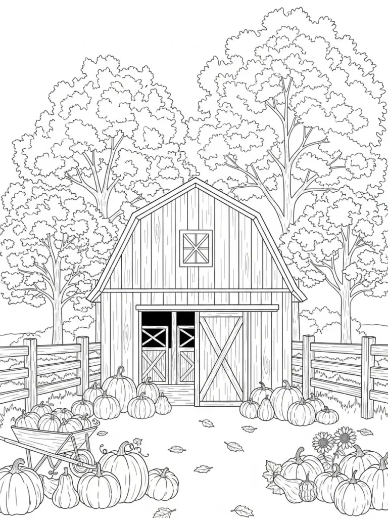 This coloring page features a charming fall barn surrounded by pumpkins, wooden fences, and tall leafy trees. The barn sits right at the center with clean straight lines and classic wooden panel details, while pumpkins of different shapes and sizes fill the foreground on both sides. A wheelbarrow, scattered leaves, and fence posts add extra countryside charm without overcrowding the scene. The line work is smooth and balanced with clear outlines that make each element easy to color while still offering plenty of detail.