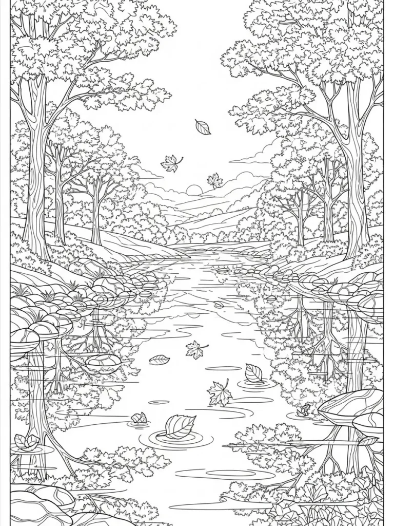 This coloring page features a peaceful river winding through a forest filled with tall trees and gently rolling hills in the distance. Leaves float across the water and drift through the air, adding a soft sense of movement to the scene. The reflections in the river mirror the trees and shoreline, creating beautiful symmetry and depth. The line work is detailed yet smooth, with fine outlines for foliage and water ripples that make the whole scene feel calm and open.