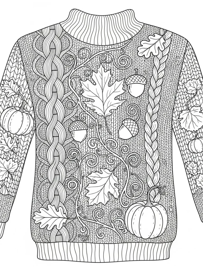This coloring page features a beautifully detailed fall sweater filled with textured knit patterns, braided cables, and swirling vine details. Pumpkins, acorns, and oak leaves are woven throughout the design, giving it a warm seasonal feel from top to bottom. The sweater shape is clear and balanced, with fine line work that captures the look of cozy fabric while keeping each section easy to color. The mix of bold sweater outlines and delicate interior details makes the whole design feel rich without being overwhelming.