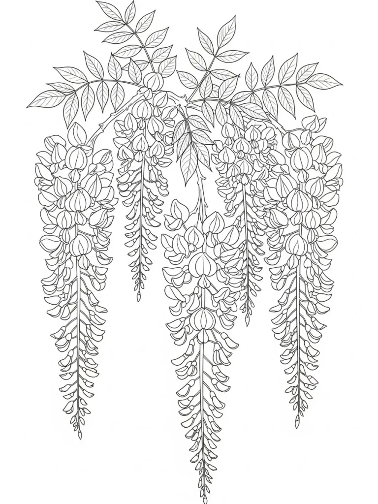 This coloring page features elegant wisteria blooms cascading downward in long graceful clusters. Each hanging strand is filled with small rounded petals that overlap softly, creating a beautiful sense of flow and movement. Slender stems and delicate leaves stretch outward at the top, framing the drooping flowers in a balanced and airy layout. The line work is fine and detailed, especially within the petal layers, while still leaving plenty of open space for coloring.