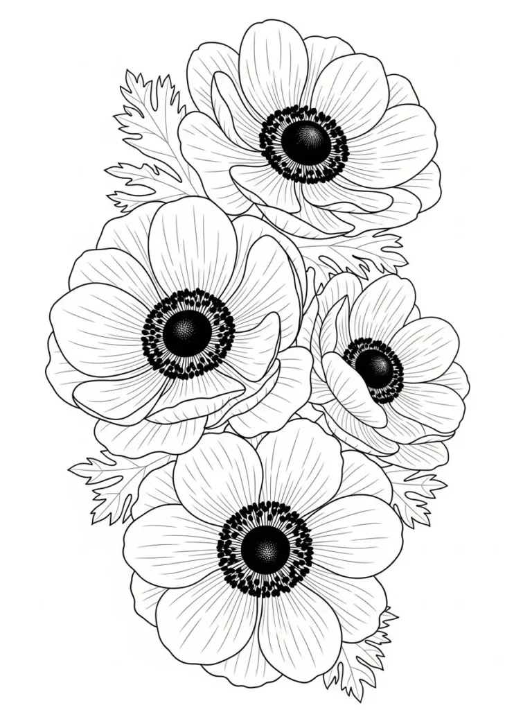 This coloring page features a striking cluster of anemone style flowers with wide open petals and dramatic dark centers. The petals have fine radiating lines that add texture and depth without making the design feel busy. Softly shaped leaves peek out between the blooms, helping frame each flower while keeping the overall layout balanced and clean. The composition feels bold yet elegant, with plenty of open space that makes the details stand out beautifully.