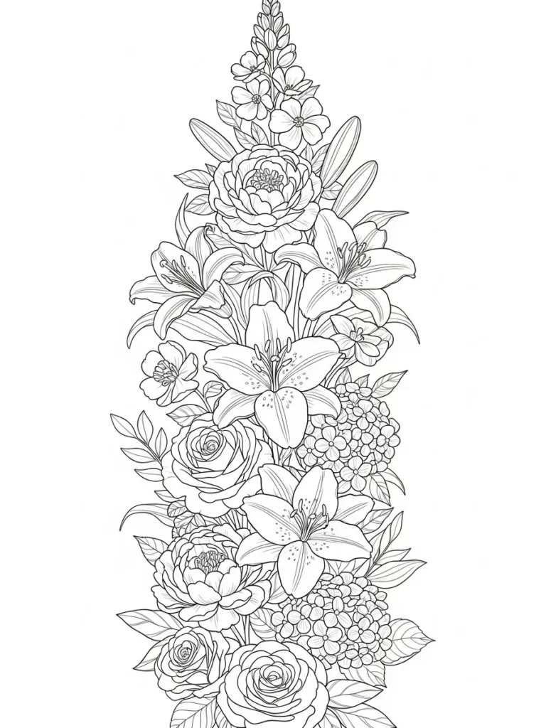 This coloring page features a tall flowing arrangement of mixed garden flowers stacked in a graceful vertical composition. Lilies, roses, and small clustered blossoms are layered together with leafy accents that guide the eye upward. The petals range from broad and smooth to softly detailed, while the leaves add texture with gentle veins and curved edges. The fine line work keeps everything elegant and balanced, making the design feel full without becoming overwhelming.