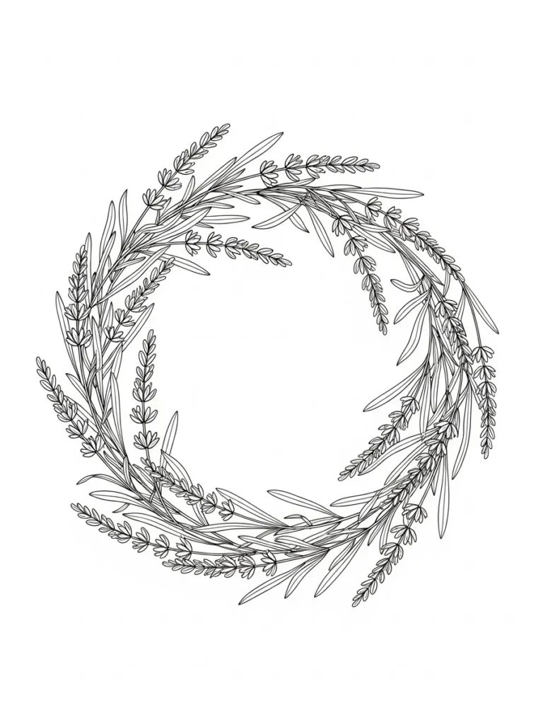 This coloring page features a soft circular wreath made from slender lavender stems and narrow leaves that curve gently into a relaxed ring shape. The small clustered blossoms repeat naturally around the wreath, creating a light and airy look that feels balanced without being too dense. The line work is fine and graceful, with simple shapes that keep the design elegant and uncluttered. The open center adds breathing room and makes the wreath feel calm and inviting.