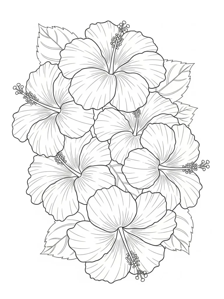 This coloring page features a lush grouping of hibiscus flowers with wide flowing petals and elegant central stamens. The petals have fine inner lines that radiate outward, giving each bloom a soft sense of movement and texture. The flowers overlap naturally, creating a full tropical arrangement balanced by gently shaped leaves around the edges. The clean line work keeps the design open and inviting while still offering enough detail for careful coloring.