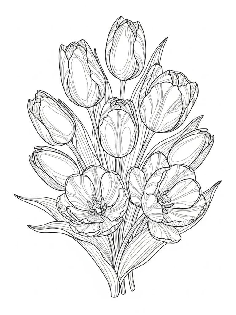 This coloring page features a charming bouquet of tulips in different stages of bloom, from tightly closed buds to softly opened flowers. The petals have smooth curved lines with gentle inner details that add depth without making the design feel busy. Long slender leaves frame the flowers and flow naturally upward, giving the whole arrangement a light and graceful shape. The clean line work keeps everything crisp and easy to color.
