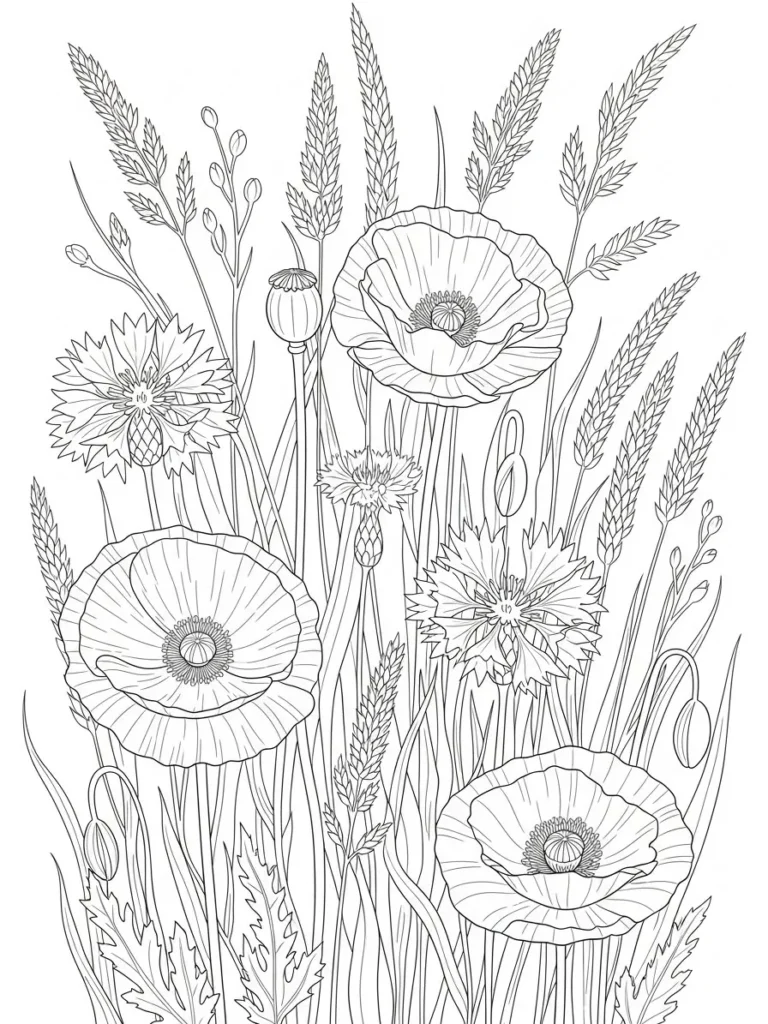 I love coloring pages like this when I want something peaceful and a little dreamy. Moving between the bold poppy petals and the slender grasses feels relaxing and keeps my hands busy in a gentle way. I usually play with warm reds and soft neutrals, then add muted greens and golds for the grasses. This page always makes me feel like I am coloring a quiet summer field one calm stroke at a time.