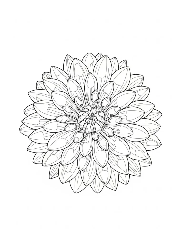 This coloring page features a stunning dahlia inspired bloom with layers of pointed petals radiating outward in perfect symmetry. Each petal is outlined with clean fine lines and gentle inner details that add texture while keeping the design crisp and balanced. The circular layout draws the eye toward the detailed center, creating a sense of harmony and flow. It feels bold and elegant at the same time, with plenty of open space between petals to make coloring enjoyable.