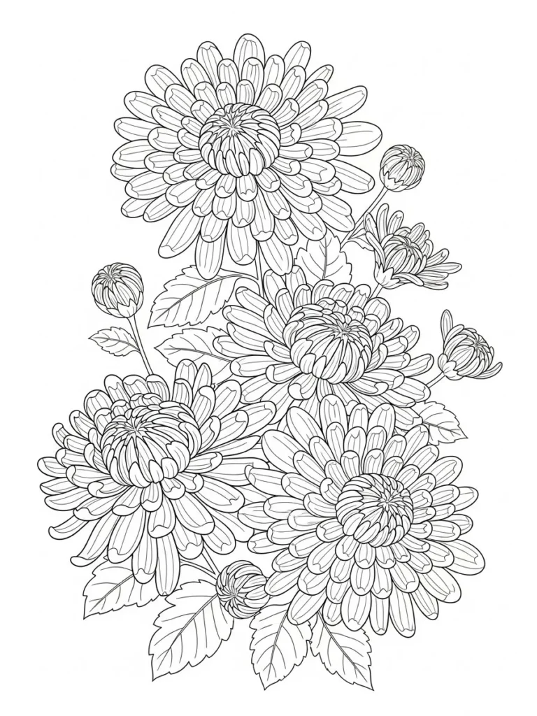 This coloring page showcases a full bouquet of chrysanthemum style blooms with beautifully layered petals that curl and overlap in rich detail. Each flower feels plush and full with rounded centers, delicate petal lines, and a mix of open blooms and tight buds. The leaves add gentle texture with soft veins and curved edges, and the overall layout feels balanced while still looking natural and organic. The line work is fine and consistent, giving plenty of space for shading without feeling crowded.