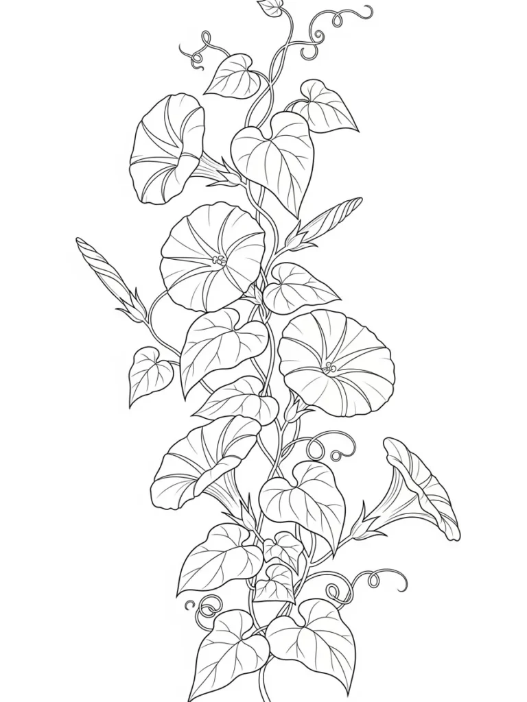 This coloring page features a graceful morning glory vine climbing upward with trumpet shaped blooms and heart like leaves woven along curling stems. The flowers open softly with gentle inner lines that guide the eye toward their centers, while the vine twists naturally with playful tendrils and flowing movement. The layout feels light and vertical, giving each bloom room to shine without crowding the page. The clean fine line work keeps everything airy and elegant.