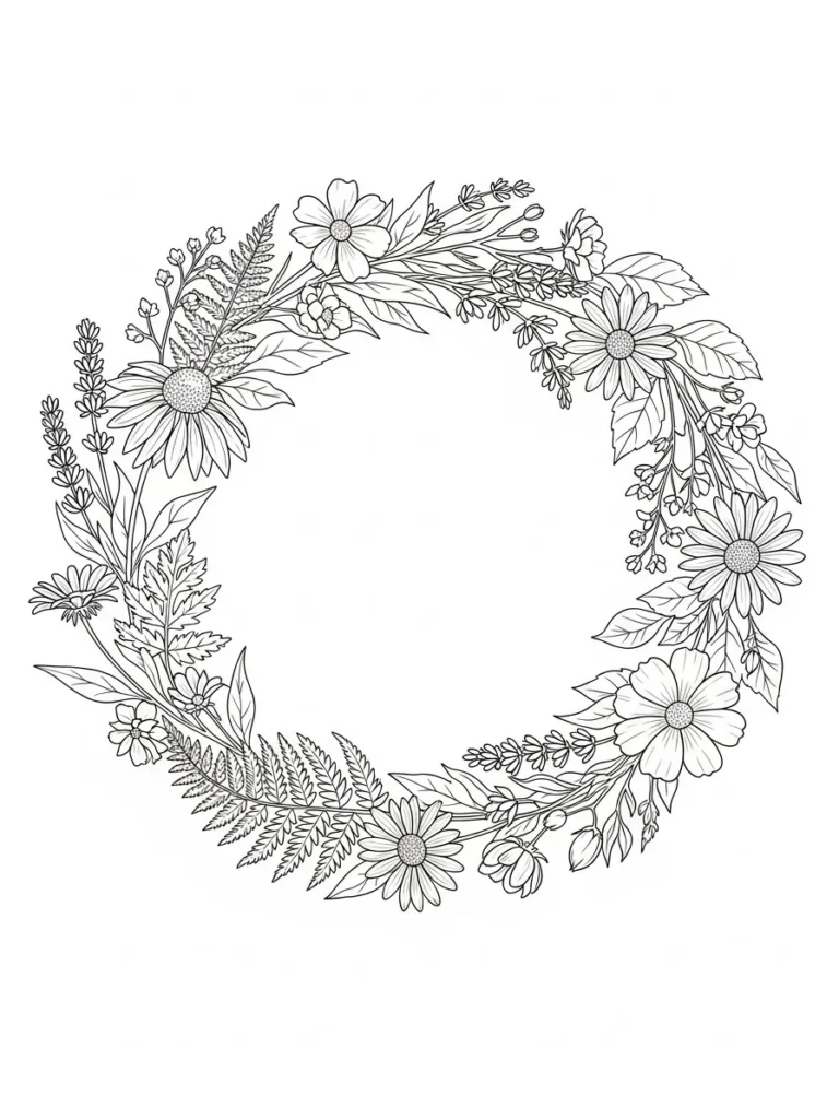 This coloring page features a cheerful circular wreath made from a mix of daisies, small blossoms, leafy sprigs, and fern like accents. The flowers are spaced in a relaxed way that feels natural and slightly playful, with fine line work that keeps everything light and airy. Each section of the wreath has its own little cluster of petals and leaves, creating gentle variety while still feeling balanced. The open center gives the design a calm focal point and plenty of breathing room.