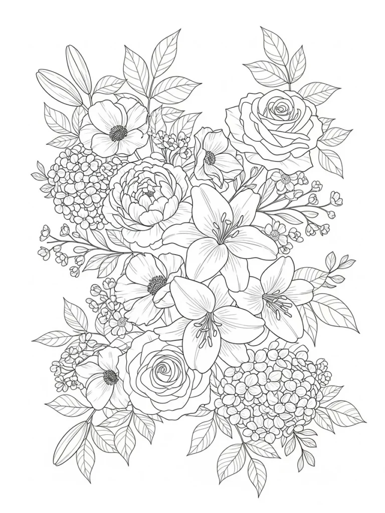 This coloring page features a lush garden style bouquet filled with a beautiful mix of roses, lilies, peonies, and small clustered flowers. The blooms overlap naturally, creating a full and layered composition that feels abundant without looking chaotic. Each flower has its own distinct petal shape and inner detail, while the surrounding leaves add movement with soft veins and flowing lines. The line work is fine and clean, giving plenty of space to enjoy shading and color blending across the different textures.