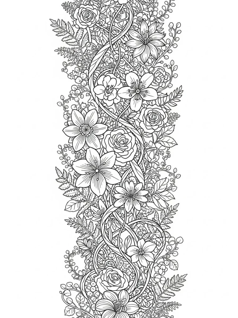 This coloring page features a tall vertical arrangement of intertwined flowers and curling vines that feel elegant and full of movement. Roses, open blossoms, buds, berries, and leafy sprigs are layered closely together, creating a rich botanical tapestry from top to bottom. The lines are fine and detailed, especially in the petals and leaves, while the swirling vines guide your eye gently through the entire design. The narrow panel layout makes it feel decorative and artistic, almost like a floral wall hanging.