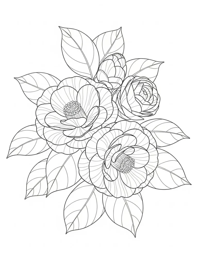 This coloring page highlights a graceful cluster of camellia style blooms with smooth layered petals and rounded centers. The flowers overlap gently, creating a cozy composition that feels full without being crowded. Large leaves frame the blossoms and add contrast with their flowing veins and curved shapes. The line work is clean and even, with fine details inside the petals that invite careful coloring while still leaving plenty of open space.