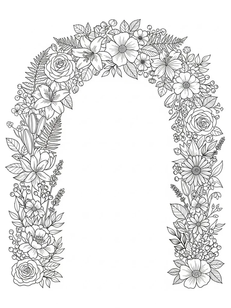 This coloring page features a graceful arch made entirely of layered flowers, leafy sprigs, berries, and fern like details that curve softly around an open center. Roses, daisies, and delicate blossoms are woven together in a balanced flow that feels full but not heavy. The line work is fine and detailed, especially in the petals and leaves, while the open middle gives the whole design a light and airy feel. It looks like a hand drawn garden frame waiting to be filled with color.
