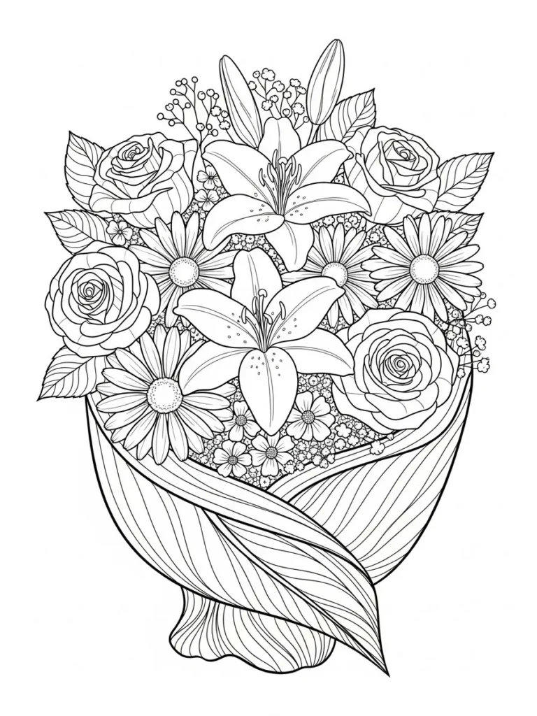 This coloring page shows a beautiful hand wrapped bouquet filled with lilies, roses, daisies, and tiny filler flowers all nestled together. The blooms overlap in a cozy layered arrangement, with soft rounded petals mixed with long elegant lily shapes. The wrapping leaves curve around the base of the bouquet and add flowing lines that balance the detailed flowers above. The line work is clean and fine, giving plenty of room for shading while keeping every flower easy to recognize.