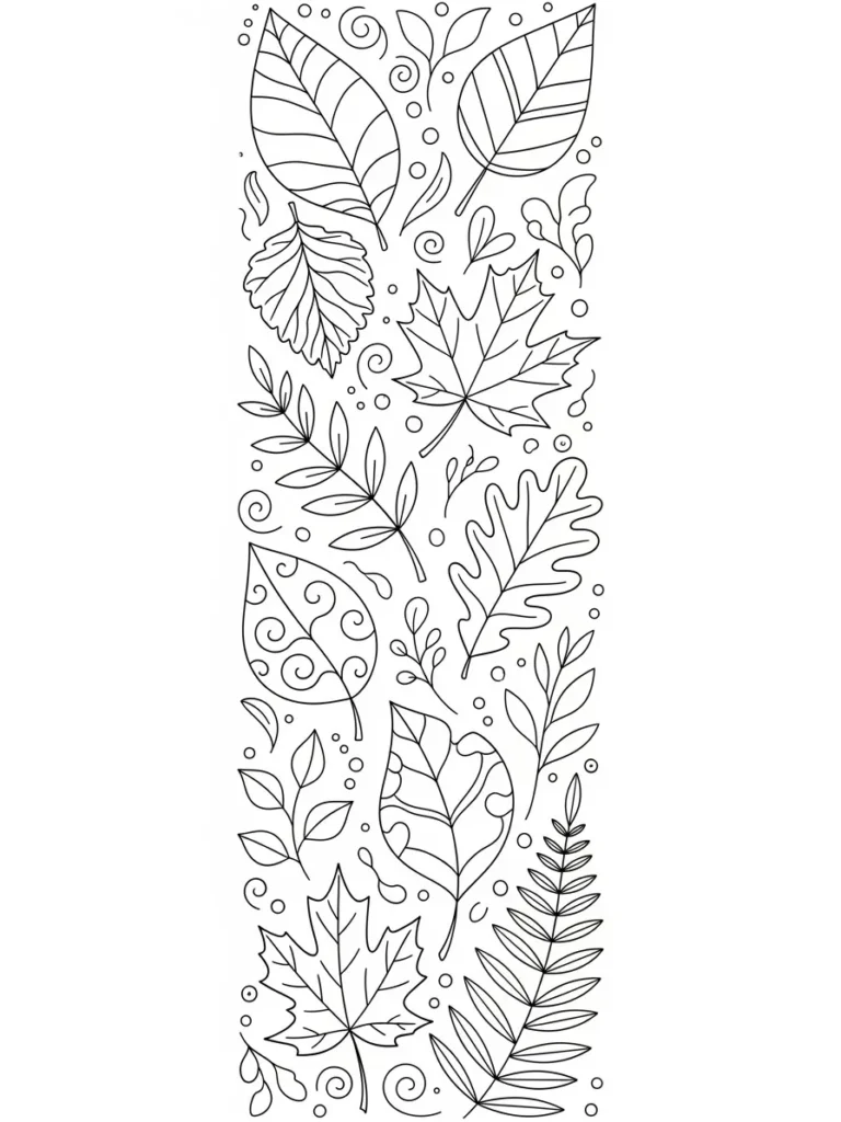 This coloring design features a vertical strip packed densely with various kinds of leaves and botanical elements arranged in a beautiful, nature-inspired border pattern. We see familiar shapes like the maple and oak leaves mixed with delicate sprigs and a finely detailed fern frond running along the edge. A few of the larger leaves include subtle internal scrollwork and patterns, breaking up the natural veins and adding an element of fantasy patterning. The line thickness is uniformly medium and clear, making every single leaf distinct and easy to color.