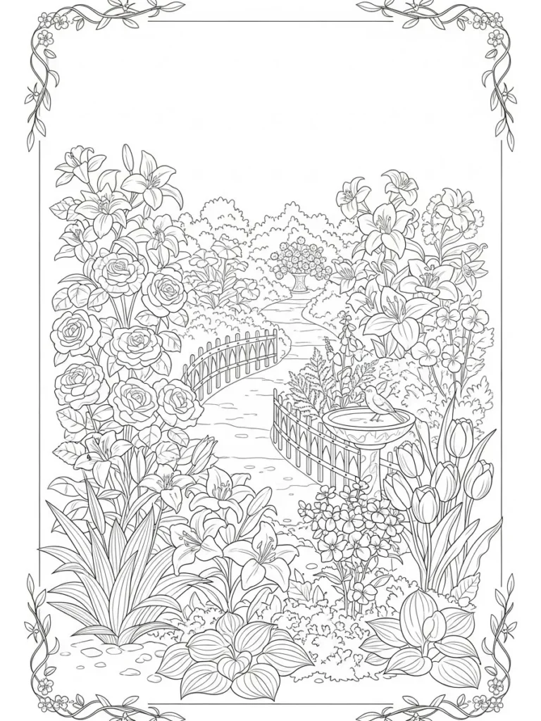 This page offers a picture of pure horticultural heaven, depicting a winding garden path leading toward a distant, lush background area featuring a potted tree or shrub. The path is gently fenced on both sides by charming, low picket fences. The foreground and sides are absolutely overflowing with detailed flowers like roses, lilies, tulips, and hostas, creating two massive, lush borders. Adding a sweet touch is a little bird perched on a birdbath nestled among the blooms, all enclosed by a simple vine border at the corners. The line work is clean and detailed, especially within the dense flower clusters.