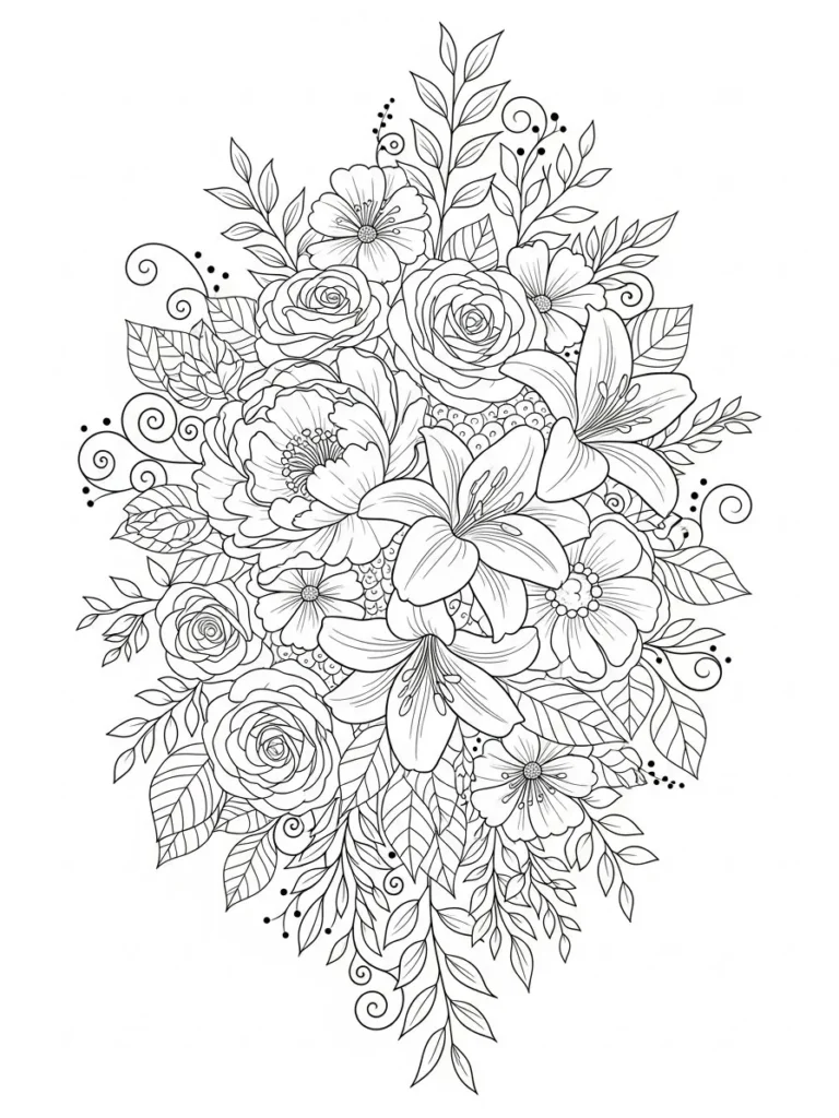 This coloring page features an opulent, vertical arrangement of mixed garden flowers overflowing with detail, creating a beautiful cluster of blooms. The composition includes large, fully bloomed roses, dramatic lilies with prominent stamen details, and smaller, multi-petaled daisies, all tightly packed together. These flowers are framed by numerous leaves and elegant, thin tendrils ending in small berry clusters and decorative swirls that give the bouquet a vibrant, flowing shape. The line work is clean and defined, balancing the clear shapes of the main flowers with the fine detail of the surrounding greenery.