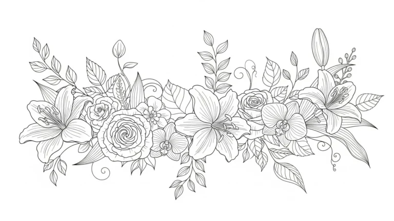 If you love a botanical challenge, this bouquet is calling your name. I find coloring flowers so wonderfully calming because I can really experiment with depth using subtle shading within the petals to make them look three-dimensional. I think using a watercolor pencil technique here would be gorgeous, allowing for soft transitions between the colors of the roses and the lilies. It’s engaging because there are so many individual blossoms and leaves to treat uniquely, and the final product is just overflowing with romantic, natural beauty.