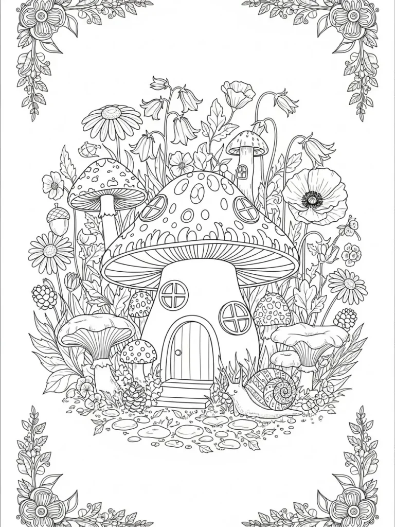Oh, this picture just screams cozy magic to me, and I think it’s incredibly fun because it allows for so much creative world-building. I plan on using bright, contrasting colors for the mushroom caps—maybe polka dots in electric pink and orange—to make them really stand out against the deep greens of the surrounding leaves. Coloring that tiny snail and the dew on the flowers will be a great way to practice subtle shading. It’s engaging because it invites you to imagine the whole tiny world that lives inside that little house.
