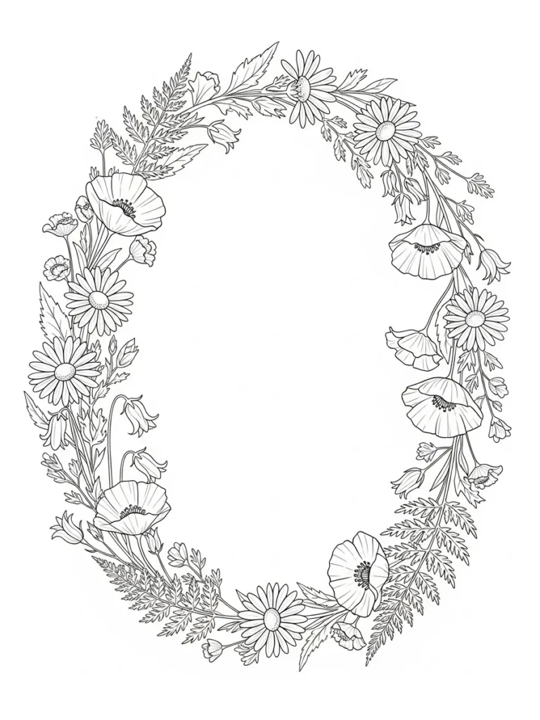 This coloring page showcases a gorgeous, dense border element shaped like a vertical oval wreath, perfect for framing text or an image. The wreath is richly decorated with a variety of wildflowers, including prominent daisies and poppies, interspersed with delicate bellflowers and lacy fern fronds. The arrangement is beautifully symmetrical around the vertical axis, creating a balanced yet organic cascade of blossoms. The line work is refined and moderately thin, giving excellent definition to the petals, leaves, and stems.