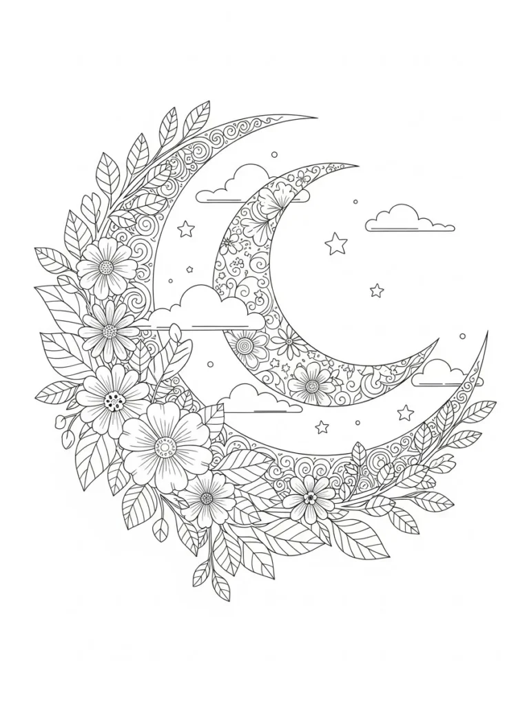 I think this page is such a lovely blend of nature and mysticism, which is totally my aesthetic. Coloring the contrasting textures between the smooth cloud outlines and the highly detailed floral scrolls is going to be so engaging. I can picture using cool, ethereal colors like lavender, silver, and pale blues for the moons and surrounding sky, then using bright pinks and yellows for the daisy centers to make them pop. It’s a very creative page that lets me play with both fine detail work and broader washes of serene, night-time color.