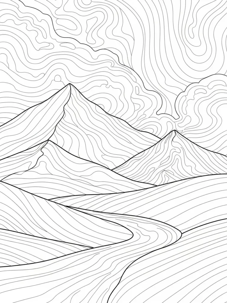 This one looks like a dream for anyone who loves abstract color blocking and gradients. I can totally see myself using earthy tones for the mountains and then playing with really soft, blended blues and grays in the sky to create a misty sunrise or sunset effect. The repetitive nature of coloring all those curves will definitely put me right into that zone where time just melts away. If you enjoy creating optical illusions or rich, textured landscapes without needing detailed objects, this page is going to keep you happily occupied for ages.