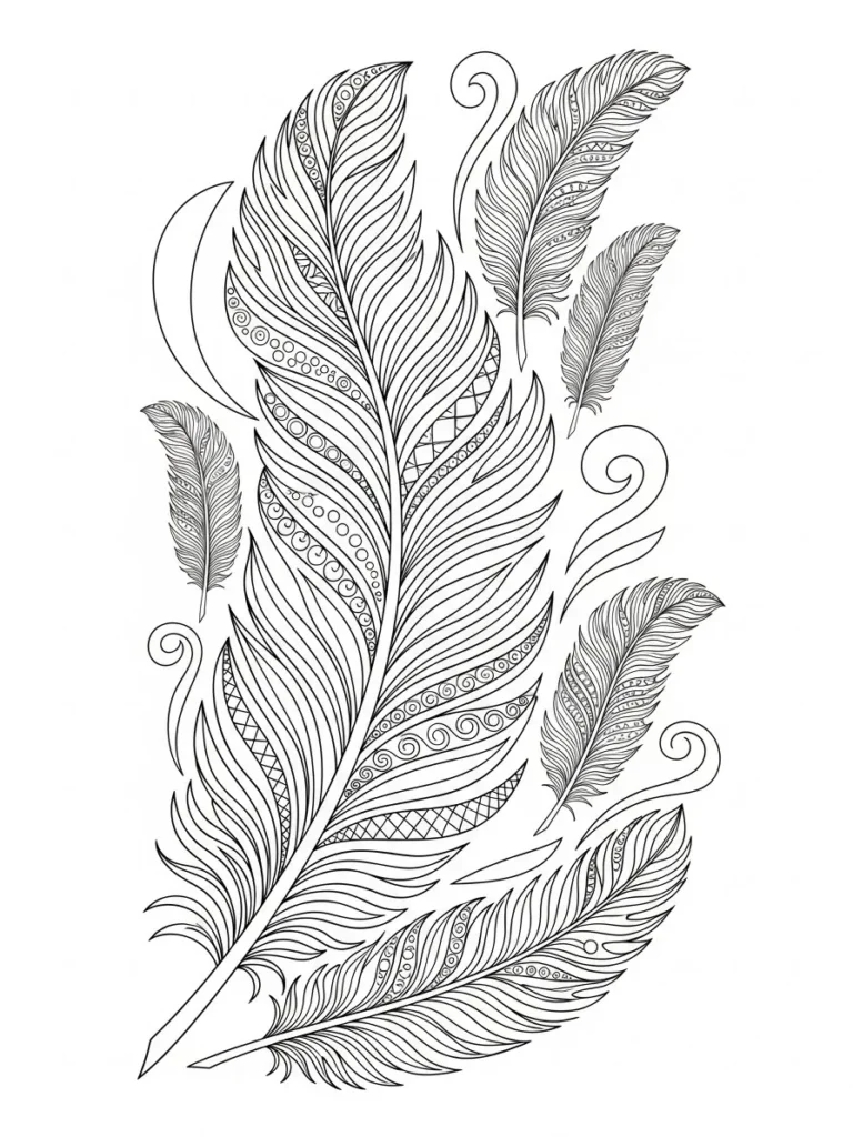 I find this pattern incredibly engaging because of the sheer variety of textures within a single theme. Coloring these feathers lets me explore so many different techniques—I can use shading on the main barb lines for depth and then fill the patterned sections with bright, contrasting colors. It’s so satisfying to see the detail emerge as you color, turning simple lines into rich, almost fabric-like textures. This is the kind of page I pull out when I really need to focus my energy and create something absolutely stunning and detailed.