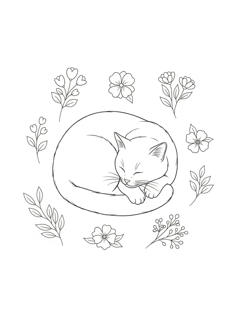 I think this page is the ultimate cozy coloring choice, perfect for a quiet afternoon when I just need something heartwarming to focus on. It is such a low-pressure design, which I love. I can totally imagine coloring the cat a soft cream or ginger tabby, and then using vibrant spring colors like lilac, soft pink, and sage green for the flowers to make it feel like a magical garden nap. If you need instant stress relief and a little boost of cuteness, this sleepy kitty scene is guaranteed to make you smile while you color.