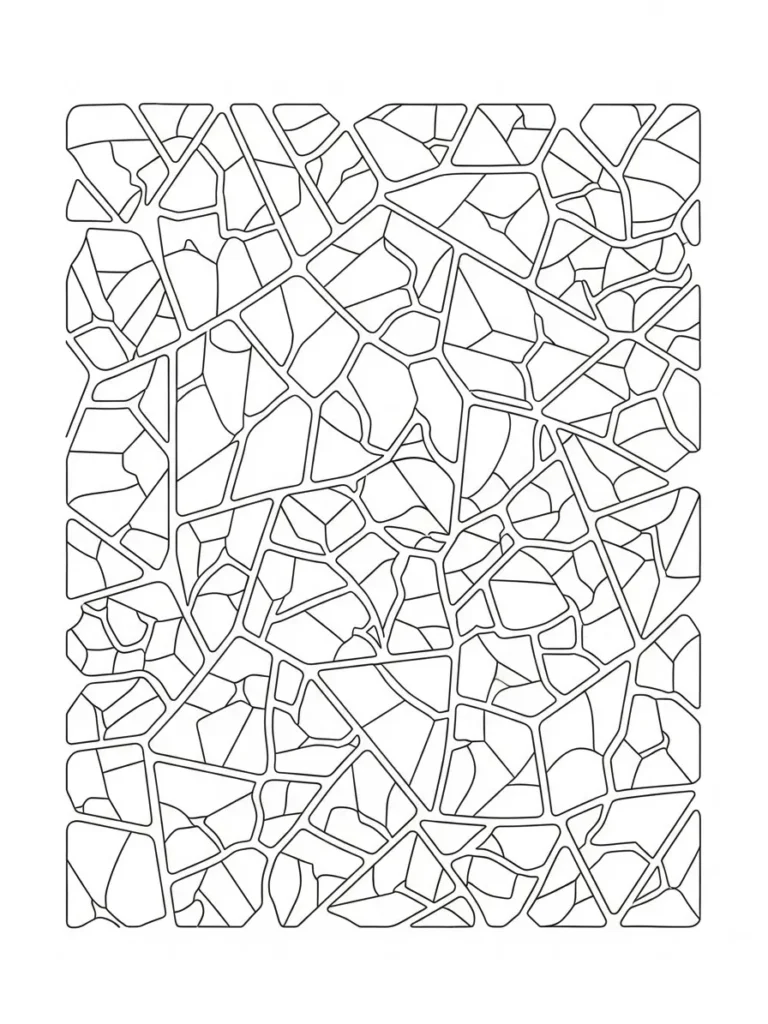 This geometric coloring page features an all over mosaic pattern made up of irregular polygon shapes that fit together like cracked stone or stained glass. The lines are clean and evenly weighted which keeps the design crisp and modern without feeling harsh. Each shape varies slightly in size and angle which creates a natural flow across the page while still feeling structured. The full page layout feels balanced and satisfying with no obvious focal point which makes it perfect for slow relaxed coloring sessions.