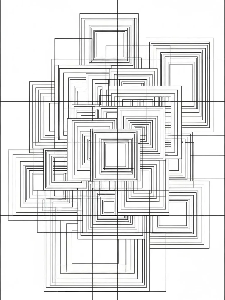 This geometric coloring page is made up of layered square outlines stacked and intersecting in a dense abstract arrangement. Thin consistent lines overlap and cross which creates a maze like effect that feels complex yet intentional. The squares vary in size and position giving the design depth and movement without losing its modern structure. The overall layout feels busy in a satisfying way with plenty of small spaces balanced by larger open areas.