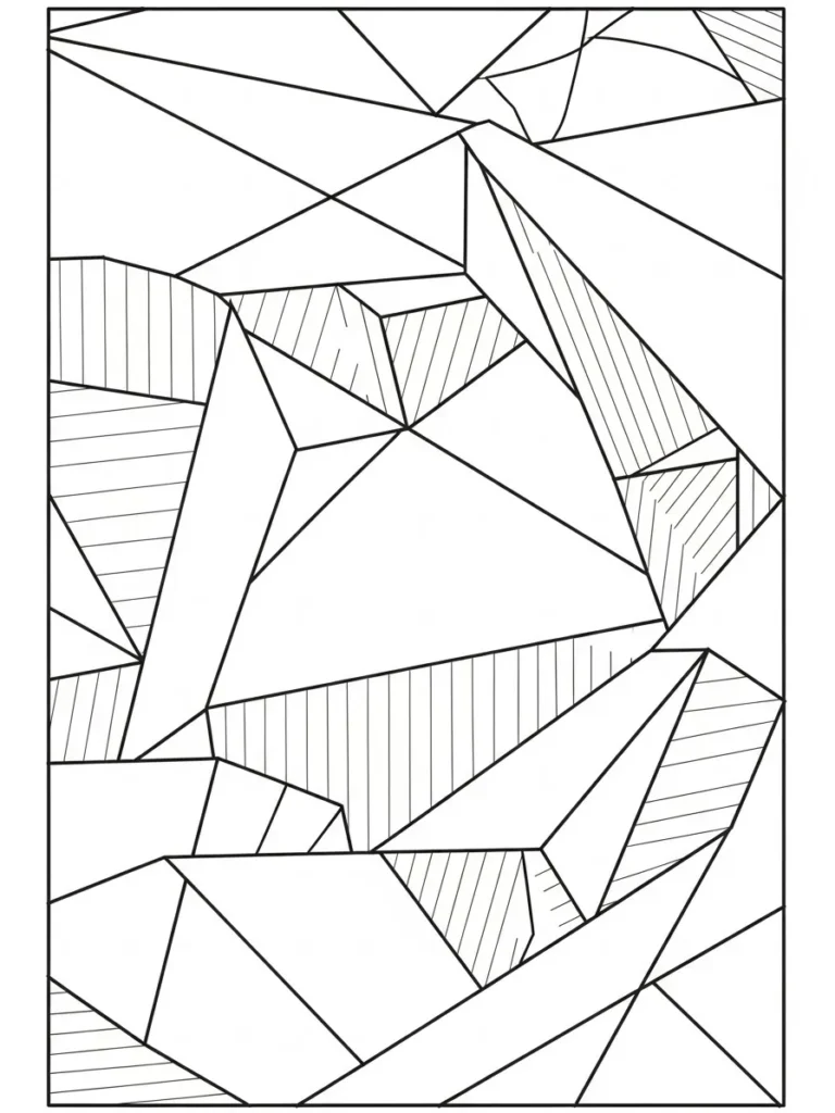 This geometric coloring page is made up of sharp angular shapes that fit together like fractured crystal planes. Triangles and irregular polygons stretch across the page with clean bold outlines and occasional striped sections that add subtle texture. The layout feels layered and dimensional as if the shapes are stacked and shifting. The line work is crisp and confident which gives the whole design a modern edgy look while still leaving plenty of open space to color.