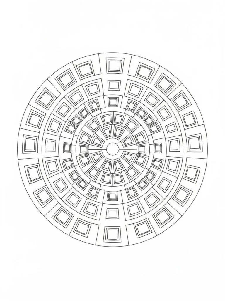 This geometric coloring page features a circular mandala made up of repeating square shapes arranged in neat concentric rings. Each square is framed within another creating a layered look that feels both structured and soothing. The lines are thin and evenly spaced which keeps the design clean and modern while still offering lots of small sections to color. The symmetry pulls everything toward the center and gives the page a calm balanced feel.