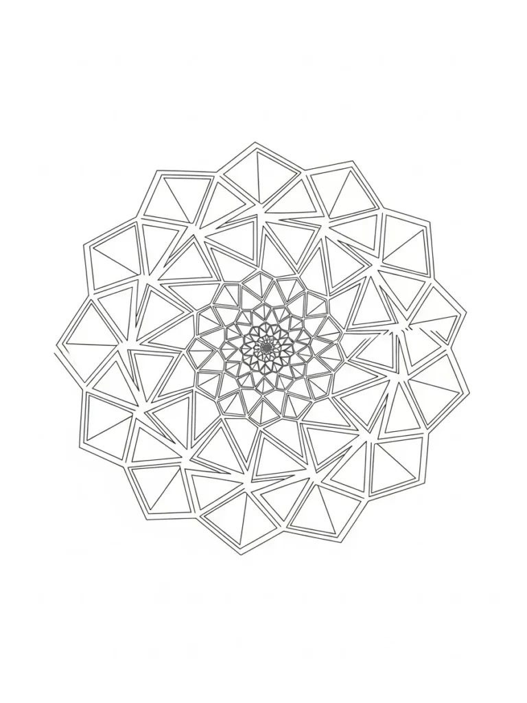 This geometric coloring page features a circular rosette built from repeating triangle shapes that spiral inward toward a finely detailed center. Each triangle is cleanly outlined with thin consistent lines which keeps the design crisp and modern. The pattern feels intricate without being heavy and the gradual shift in scale adds a beautiful sense of depth and motion. The overall layout is balanced and eye catching while still feeling light and airy on the page.